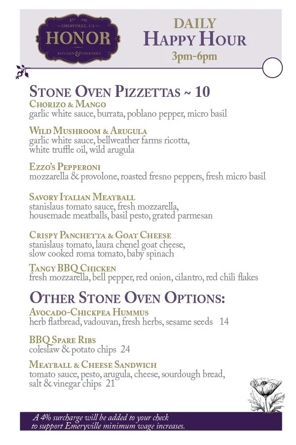 Best Bar in Emeryville 3-6pm & 9pm-close Every Day 2-Different Menus. Click Here for Late Night Happy Hour